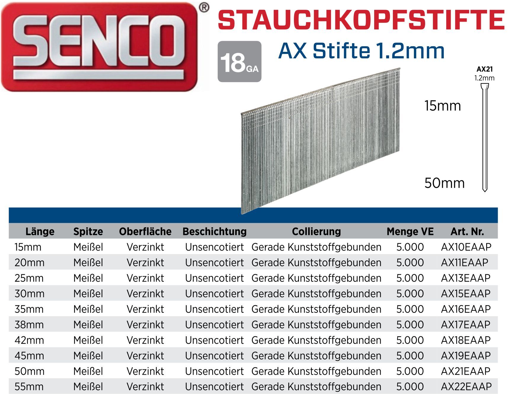 Unsere Drahtstifte Senco AX eignen sich hervorragend zum Befestigen von Leisten, Zierleisten, Bilderrahmenleisten sowie die sichtbare Befestigung von Glasleisten. Diese Nägel werden häufig in der Möbelindustrie sowie in Tischlereien und Schreinern genutzt. Unsere Diese Drahtstifte haben einen Durchmesser von nur 1.2 mm und sind in vielen Längen zwischen 15 und 55 mm verfügbar.
